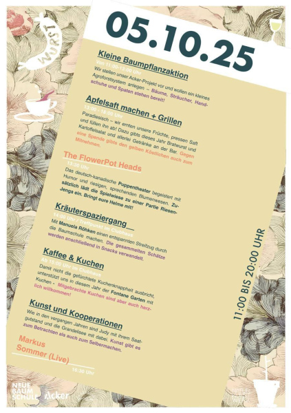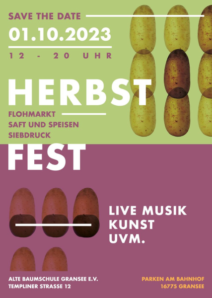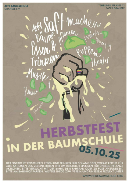 Summer is coming to an end and we want to celebrate!The Gransee Baumschule invites you to the Autumn festival again!On Sun, October 1st. There is a variety of food and drinks, activities, and performances of all kinds on the Baumschule grounds. You and all your loved ones from big to small are cordially invited to be there. Bring rubber boots and a good mood - entry is free, and all food and drinks by donation. We will be very happy to see you! Please come by train or park your car at the train station! Until then!Erde gut, alles gut! -