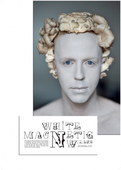 This self portrait ties in themes from the Mayan horoscope as well as Latvian mythological symbology to create a fusion of cultural dynamics. The White Magnetic Wizard represents the essence of the Magician, whose powers are activated by wisdom that emanates from the heart. For me, it is important to place myself in contexts which have meaning and give me greater perspective that I feel influence my life and spirit. This is visually reflected by the use of white and mushrooms, representative of spirituality in nature.