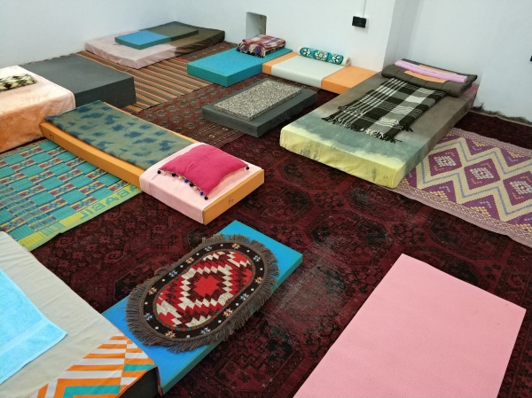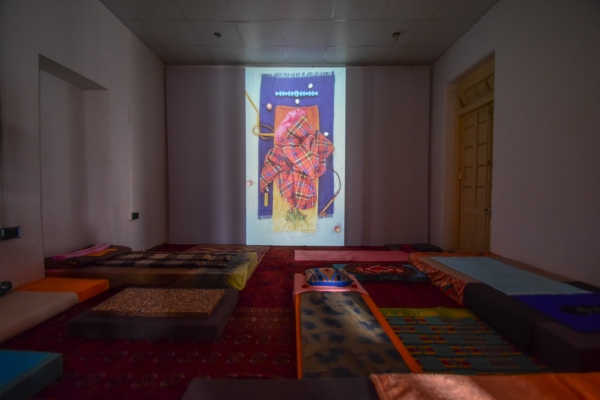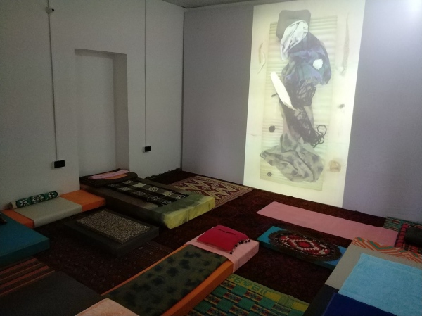 Mammal Matrix (MaMa) is a new video work by J&K created for KB17. The video consists of a looped animation of still photography images showing a colourful and vividly textured composition of bedding materials, fabrics and objects in constant transformation seen from a bird’s eye view. The painterly scenarios reference death and birth beds, and bear witness to possible rituals and stages of passage that are lived and performed in them. The image sequence is accompanied by spoken text taking the audience on a cosmic journey through multiple states of birth and death, from the edge of the universe into a womb on planet Earth. The protagonists of this journey are a basilosaurus, a chicken, a sesame seed and a meteorite: phenomena that are all loosely referencing the ancient cultural and geological history of the region that makes up today’s Pakistan. Mammal Matrix (MaMa) is offering a zoomed-out perspective on life as a continuous cycle in which being-hood shifts and where the man-made categories and borders between human and animal species, plants, minerals and things are questioned and explored. The work is shown as a projection within a full-floor installation composed from various soft materials allowing the audience to sit or lie down and experience the work as a form of guided meditation on the transient mysteries of life and death. The floor installation partly references the aesthetics of the video and blends it with local materials creating a communal patchwork. Mammal Matrix (MaMa)was created while J&K were personally facing actual birth and dying processes and the artists wish to thank Linards Kulless (production assistance) and Fritz Stollberg (photography and edit) for their great personal and artistic support. Text for the video was written with and spoken by Jonathan Bonnici. The work was realised with financial support from the Danish Arts Foundation.